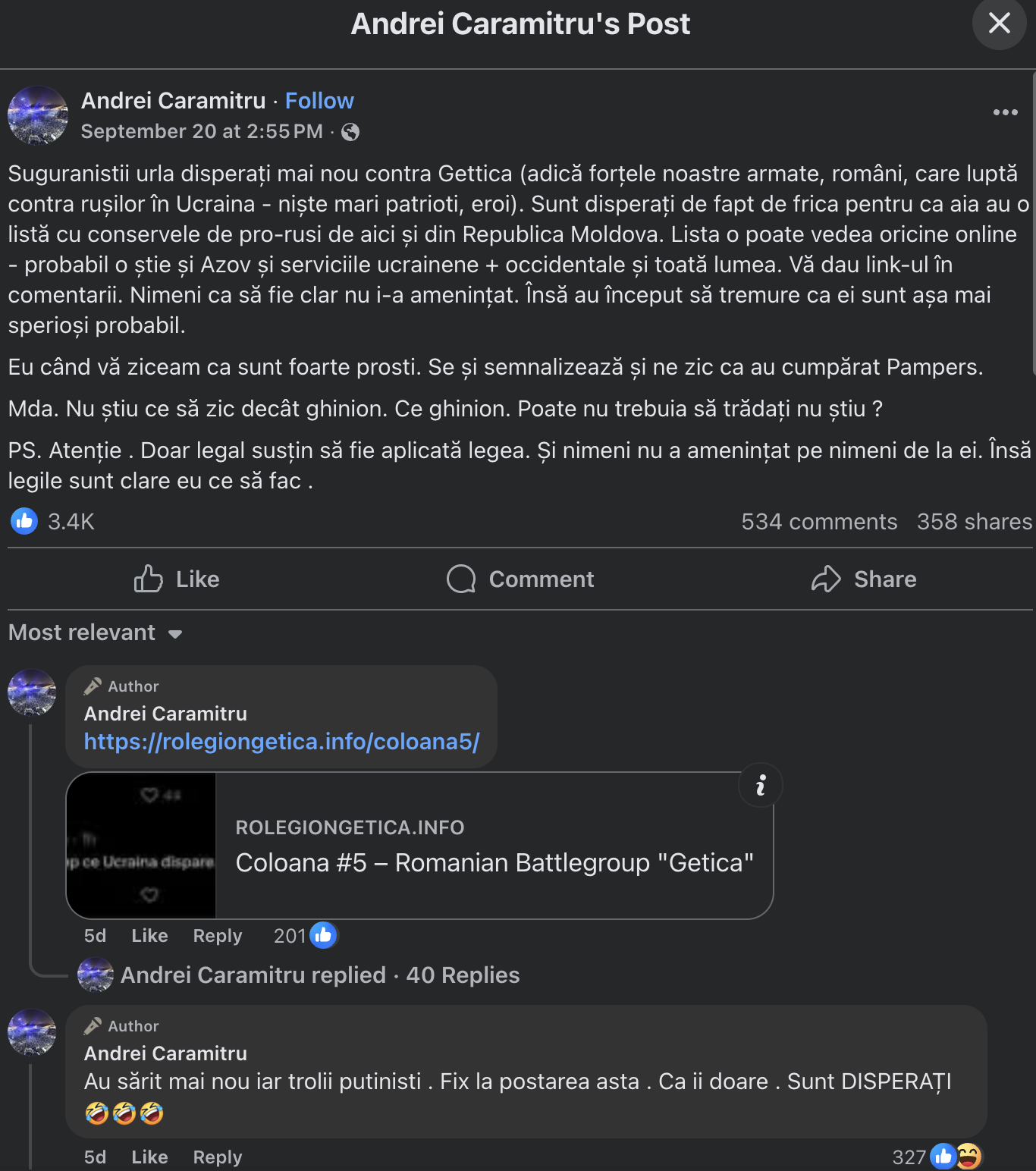 De ce am considerat necesar acest pas? Postarea care a stat la baza plângerii includea o preluare de la Legiunea Română Getica, o grupare ucraineană cu caracter paramilitar, despre care există informații publice că desfășoară activități ilegale pe teritoriul României. În acel material apare o listă de persoane considerate „ținte”, etichetate drept „rusofile”, listă pe care se regăsesc președintele și un alt membru al organizației noastre.