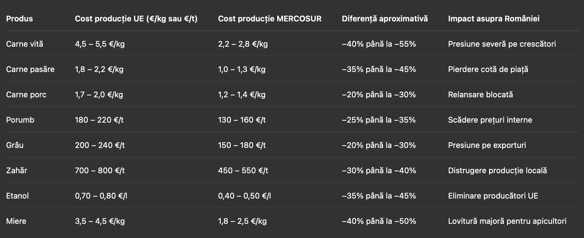 TABEL COMPARATIV – COSTURI ȘI PREȚURI ORIENTATIVE (UE vs MERCOSUR)